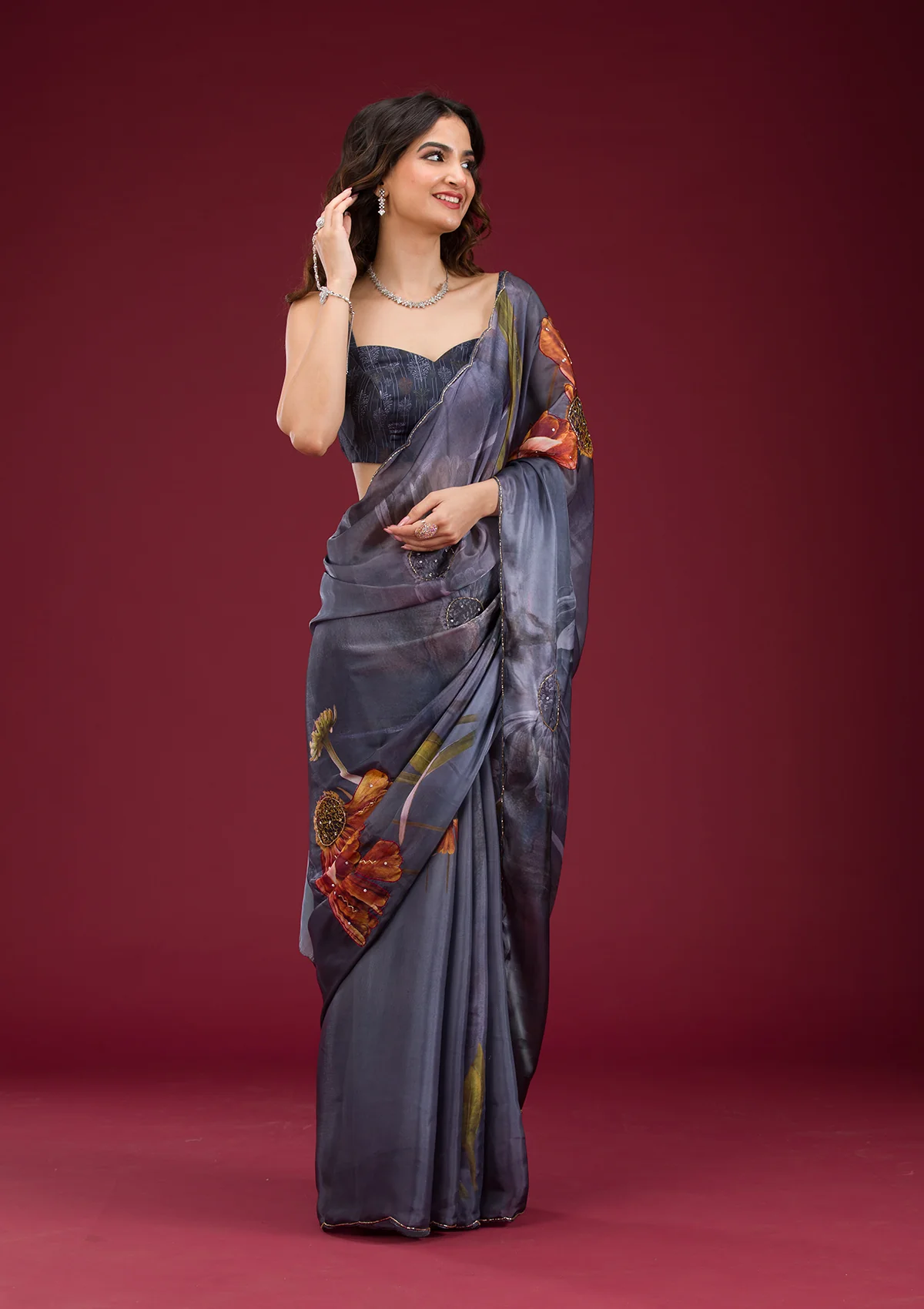 Navy Blue Printed Tissue Saree